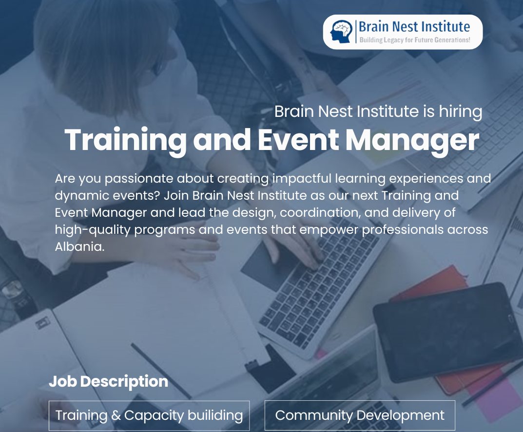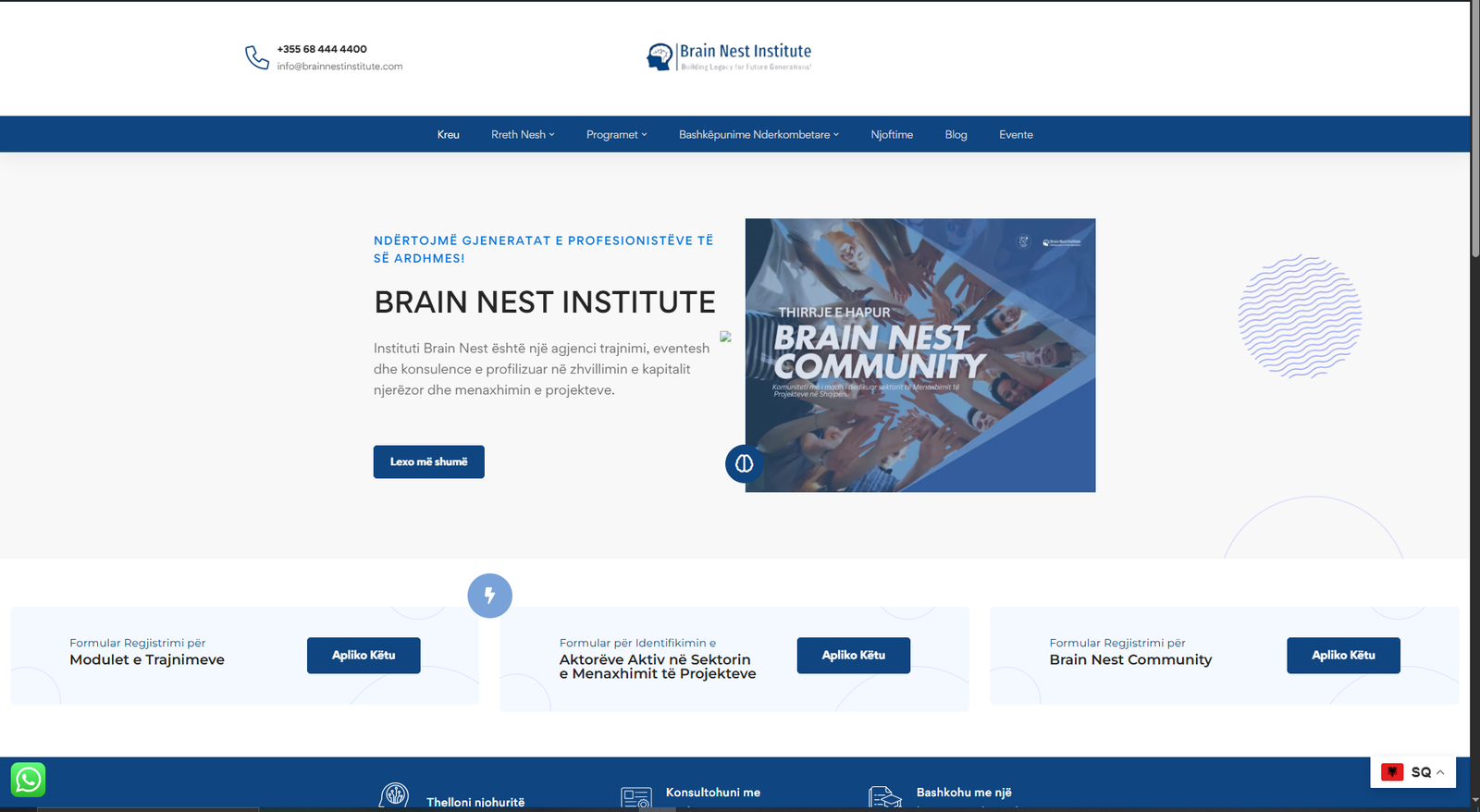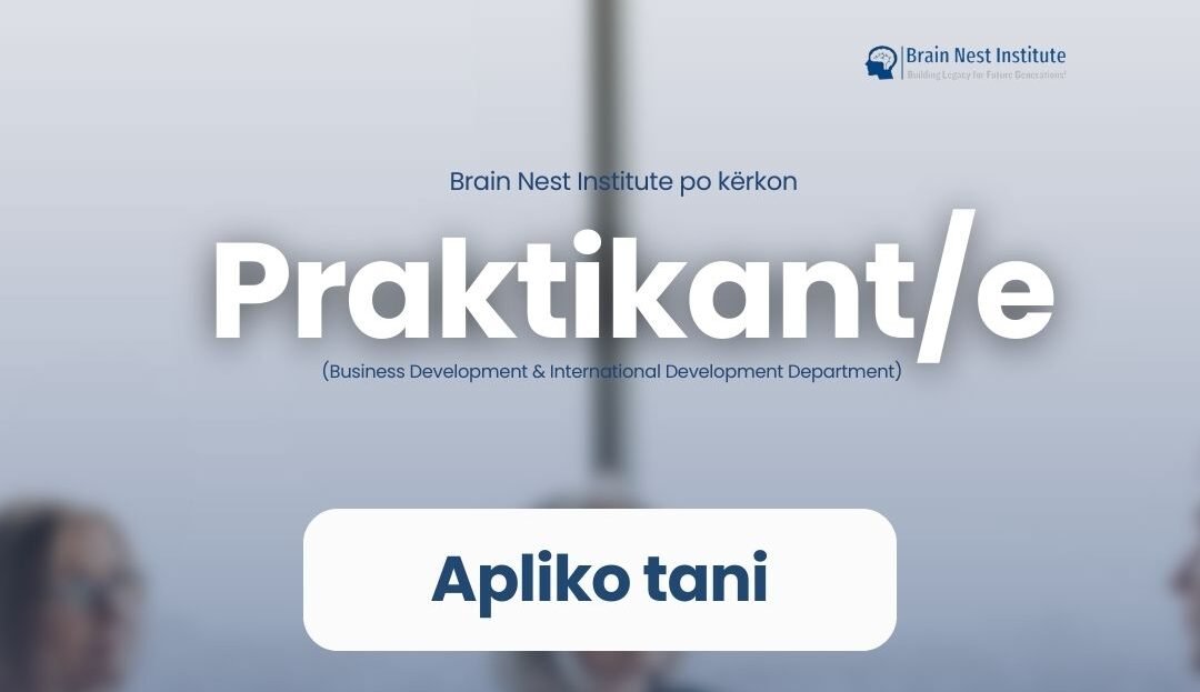 Njoftime Pozicion i Hapur: Ekonomist/e January 20, 2026 Lexo me shume » Thirrje për Praktikantë– Mundësi internshipi January 20, 2026 Lexo me shume » Thirrje për Praktikantë- Mundësi Internshipi January 20, 2026 Lexo me shume » Një fundvit me dije dhe mundësi me trajnimet e Brain Nest Institute December 18, 2025 Lexo me shume » Brain Nest Platform, një hap i ri për profesionistët e menaxhimit të projekteve në Shqipëri. December 17, 2025 Lexo me shume » Brain Nest Platform – Trajnime Praktike për Menaxhimin e Projekteve December 9, 2025 Lexo me shume » Çfarë ofron Brain Nest Platform? November 19, 2025 Lexo me shume » Lançimi i Brain Nest Platform November 15, 2025 Lexo me shume » Platforma Brain Nest – Lançohet së shpejti October 15, 2025 Lexo me shume » Join to the Brain Nest Institute – Pool of Experts September 4, 2025 Lexo me shume » Njoftim Pune – Koordinator Eventesh dhe Trajnimesh September 3, 2025 Lexo me shume » Njoftim Pune – Asistent/e Projektesh September 3, 2025 Lexo me shume » Page1 Page2 Page3 Page4 Page5 Kerko Search for: Search Kategorite Blog (56) Njoftime (49) Uncategorized (2) Postimet e Fundi Blog She’s Next: Fuqizimi ekonomik i grave dhe akses në mundësi April 17, 2026 Blog Brain Nest Platform April 16, 2026 Blog Një reflektim mbi eksperiencën në Brain Nest Academy – Grant Intelligence Program April 14, 2026