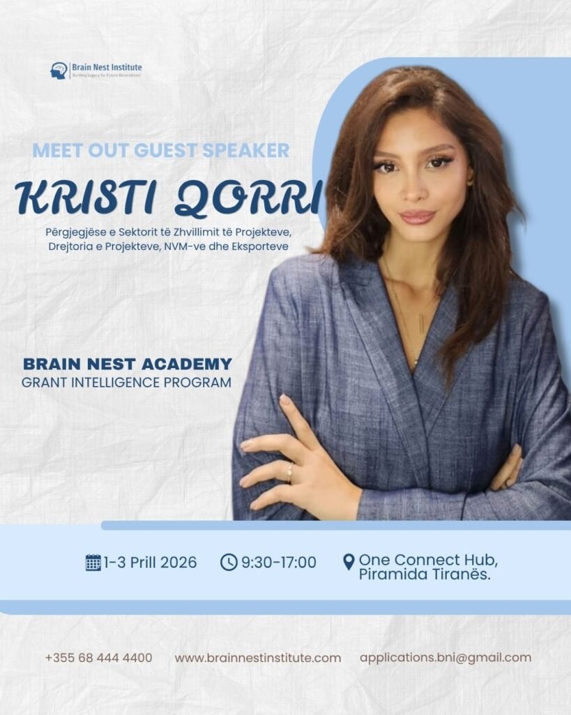 Në kuadër të Brain Nest Academy, ajo do të sjellë këtë eksperiencë praktike dhe perspektivë institucionale, duke ndarë me pjesëmarrësit njohuri konkrete mbi zhvillimin e projekteve, aksesin në mundësi financimi dhe mënyrat efektive për të pozicionuar bizneset dhe organizatat në ekosistemin kombëtar dhe ndërkombëtar. Përmes sesionit të saj, pjesëmarrësit do të kenë mundësinë të kuptojnë më mirë si të identifikojnë mundësi reale bashkëpunimi dhe të ndërtojnë iniciativa që gjenerojnë impakt dhe rritje të qëndrueshme.