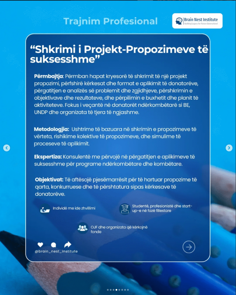 Në këtë trajnim, do të mësoni të hartoni projekt-propozime profesionale që tërheqin financuesit dhe rrisin shanset për miratim.