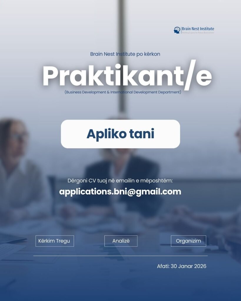 Nëse je një i ri i talentuar, profesionist dhe me dëshirën për të mësuar gjëra të reja, kjo thirrje është për ty. Brain Nest Institute po kërkon praktikantë të motivuar që dëshirojnë të zhvillojnë karrierën e tyre dhe të përfitojnë eksperiencë të mirëfilltë profesionale në fushat e Zhvillimit të Biznesit, Hulumtimit dhe Kërkimit të Tregut si dhe Zhvillimit të Projekteve.